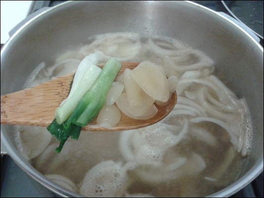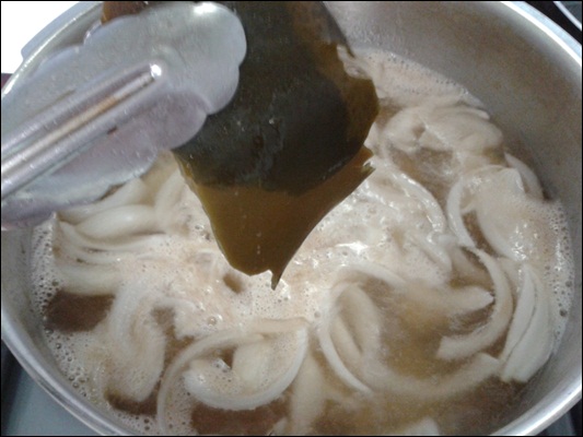 여기에 다시마와 쯔유 2와 물을 붓고 끓이다가 육수가 끓으면 다시마는 건져주세요