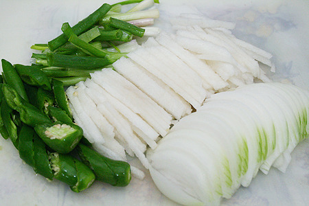 양파와 배는 채썰고, 파는 열무길이에 맞춰서 썰고, 고추는 어슷 썰어놓으시면 돼요.
