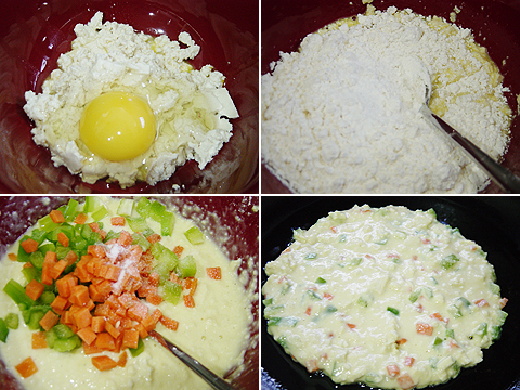 1. 두부는 물기를 꼭 짠 후 으깨놓습니다.2. 으깬 두부에 계란을 잘 섞어준 후 밀가루와 우유를 넣고 잘 풀어줍니다.3. 다진 당근과 피망을 넣고 섞은 후 소금간을 약간 해주세요.4. 후라이팬에 오일을 두르고 도톰하게 부쳐냅니다.