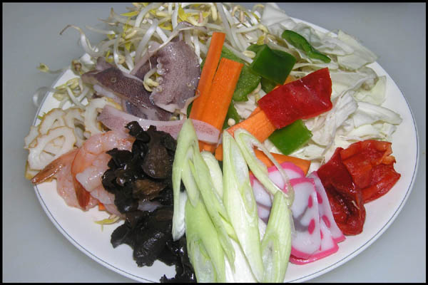 돼지고기등심 150g, 오징어 40g, 새우 40g, 숙주 40g, 청홍피망 각25g, 당근 20g