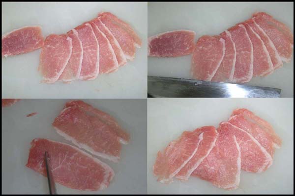 1. 돼지등심을 얇게 져며 포를 떠주고 깔집을 내주면 고기가 연해집니다.