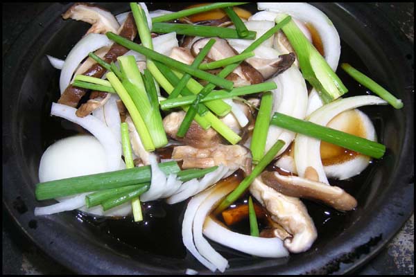 4. 나베그릇에 양파를 깔아주고 불린표고를 올려줍니다.