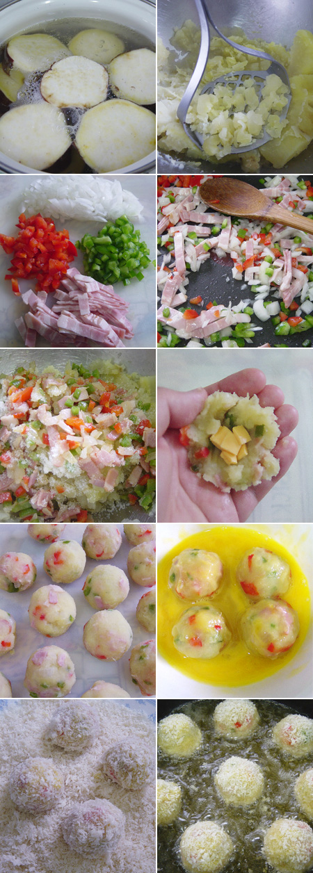고구마 중 사이즈로 2개 정도, 청홍피망 1/4개씩, 양파 1/2개, 베이컨 3장, 슬라이스 치즈 2장, 소금, 설탕 약간씩, 빵가루 2컵, 계란 1~2개, 밀가루 약간