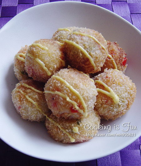 이렇게 볶아주셔서 야채의 수분이 날아가 나중에 튀길 때 고구마볼이 부서지지 않아요.
