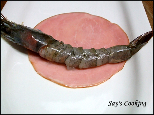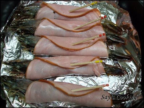 슬라이스햄에 손질한 새우를 넣고 돌돌 말아 이쑤시개로 고정해요.