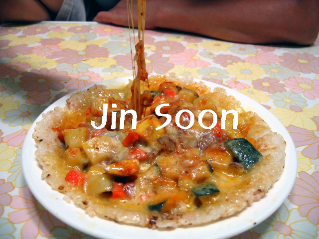 5 누룽지위 토핑들에 만들어둔 피자소스를 골고루 바른다.