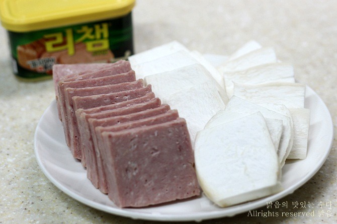 햄과 새송이 버섯을 먹기 편한 크기로 썰어줍니다.