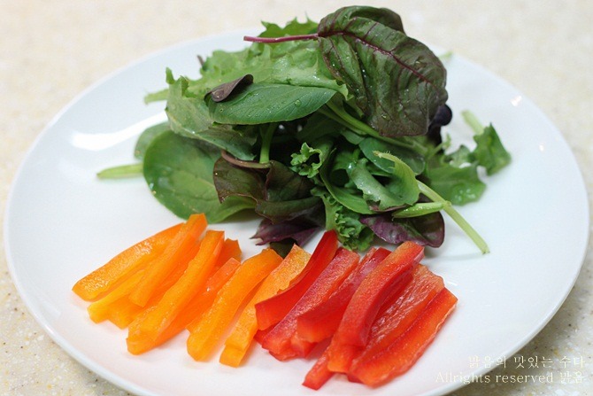 어린잎 채소랑 약간의 파프리카는 채썰어 준비하고...