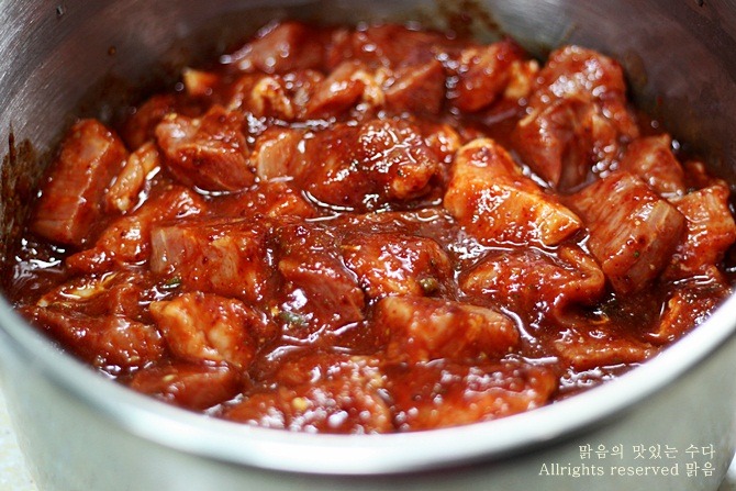 핏물 뺀 돼지고기에 양념 넣어 골고루 버무린 뒤