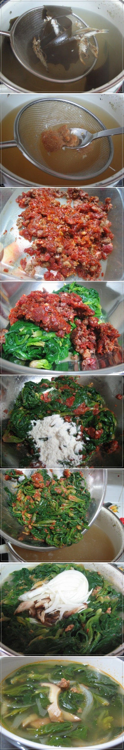 4. 멸치육수에 위의 시금치를 넣고 한번 끓인뒤 채썬 양파와 데쳐서 채썬 표고버섯을 얹어서 한번더 끓입니다.