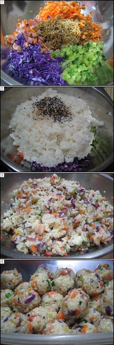 동글동글 한입에 쏙~ 들어가도록 살짝 조물조물해서 주먹밥을 만들어 도시락에 담아주세요.