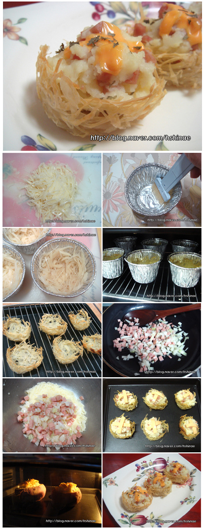 3.가늘게 채썰어둔 감자를 마치 새둥지모양으로 베이킹컵에 담아주세요.