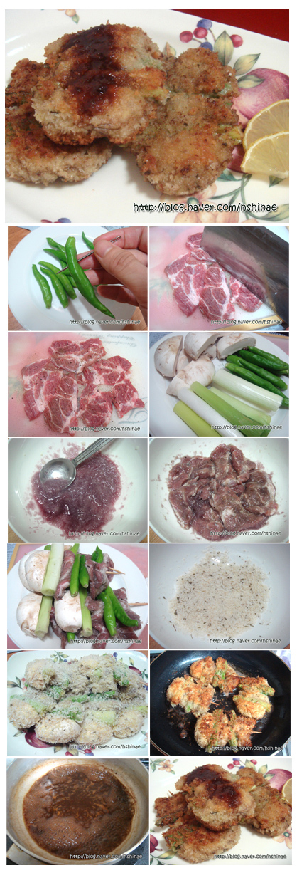 돼지목심 100g, 꽈리고추 12개, 대파 줄기부분 6개, 양송이버섯 3개, 달걀 1개, 레몬 1/2개, 빵가루, 밀가루 약간씩, 카놀라유, 고기 밑간 : 허브솔트, 뿌려먹는 녹차, 후추