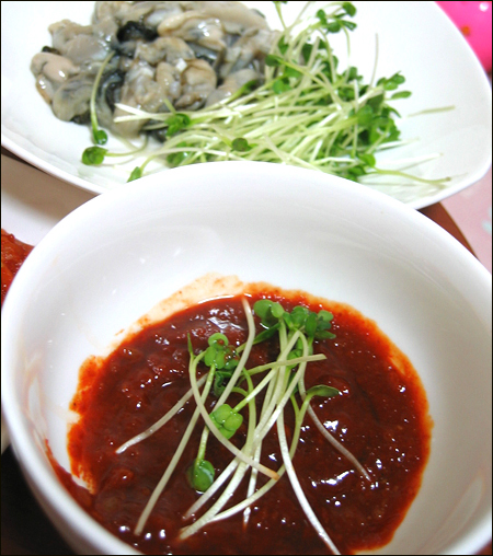 생굴, 고추장 1큰술. 식초 1큰술, 깨소금, 고춧가루 반큰술, 설탕 반큰술