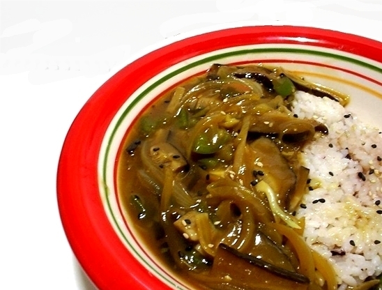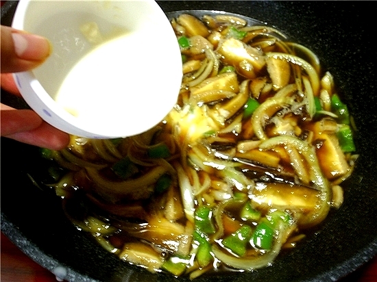 표고버섯5개,양파1/2개,피망1개,소금,후추,카놀라유, 육수,양조간장12T,맛술2T,설탕2T,올리고당1T,물전분, 참기름, 통깨