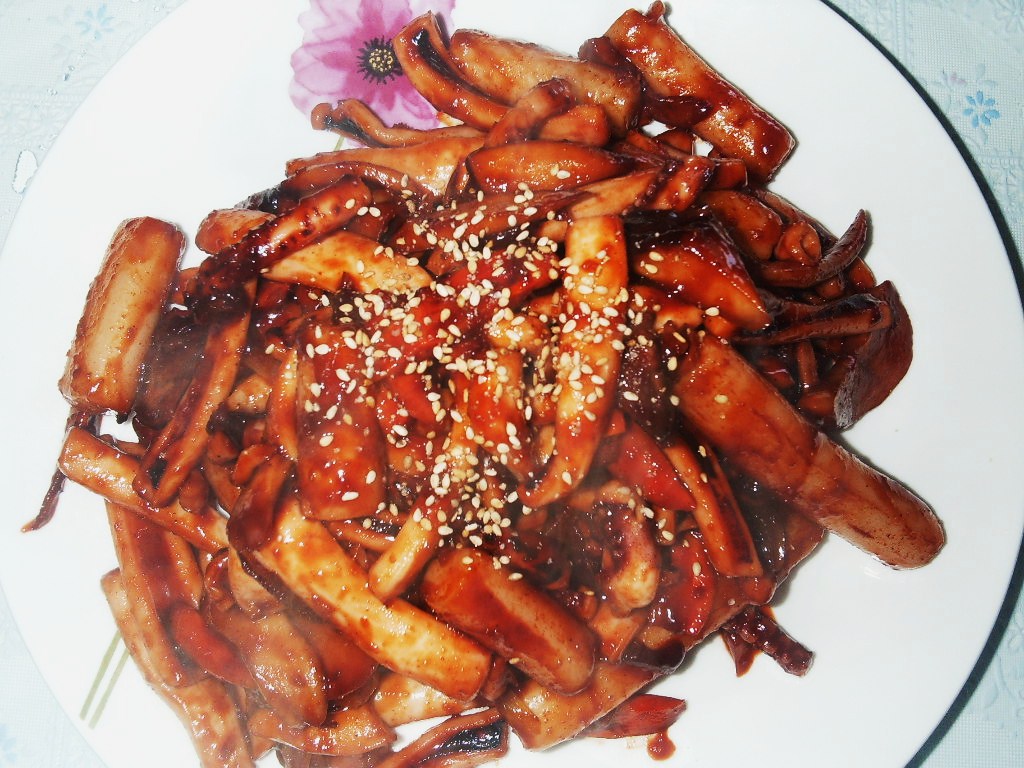 오징어,떡볶이떡, 새송이버섯, 당근, 파,고추장, 마늘, 간장, 물엿, 설탕, 깨소금