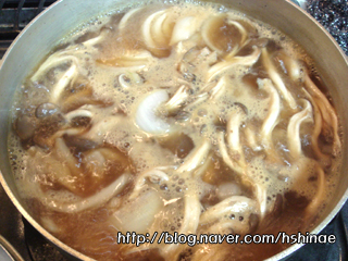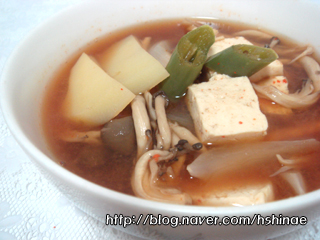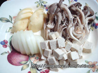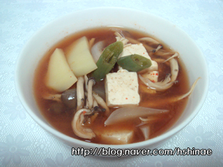 참타리버섯 2줌, 양파 1/2개, 두부 1/4모, 감자 1개, 된장 1큰술, 멸치육수 4컵, 고추 1개, 소금 약간