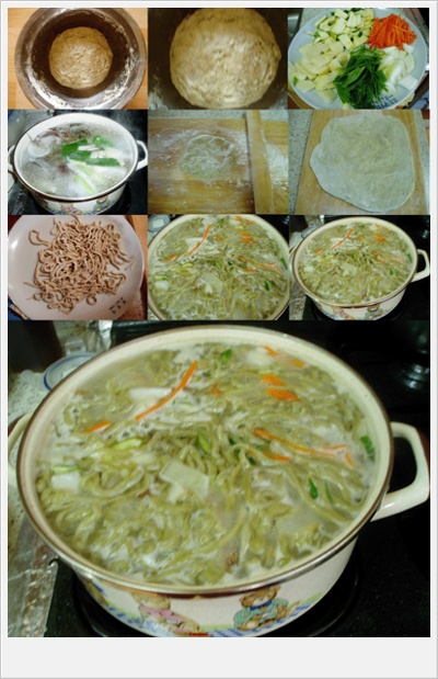 밀가루, 물 녹차가루, 밀가루(중력분), 호박, 계란, 양파, 표고버섯, 청량고추, 녹차가루 양념장(간장, 마늘, 참기름, 깨소금, 풋고추, 고추가루), 육수장(무우, 양파, 멸치, 다시마)