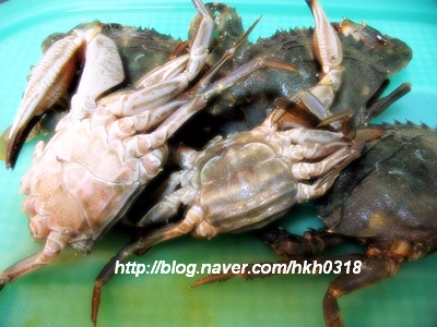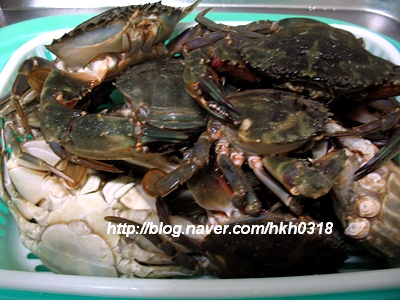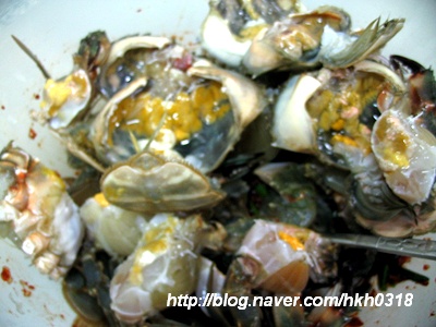 게는 등딱지를 분리하고, 먹기좋게 반으로 잘라 주었습니다. 암놈으로만 골랐더니 알들로 꽉 차 있더군요. 노란 알들이 보이시죠...![]()