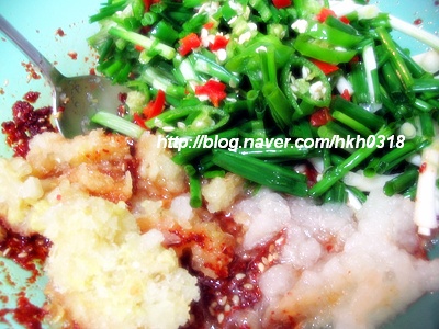 2. 실파는 적당한 크기로 썰고, 다진 마늘, 다진 생강, 강판에 간 양파, 다진 청양 고추를 양념에 골고루 섞어 줍니다. (양파를 갈아서 넣게 되면 시원하면서 덜큰한 맛이 납니다.)
