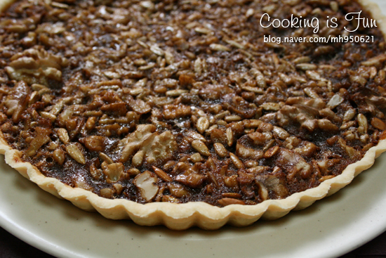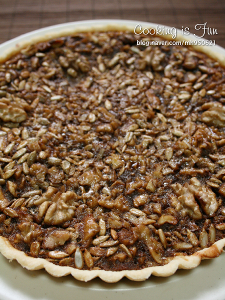 호두 1컵, 해바라기씨 1/2컵, 흑설탕 50g, 물엿 50g, 물 20g, 버터 15g,달걀 2개, 계피 1/2작은술, (선택사항 바닐라향 1g), 파이반죽 : 박력분 100g, 버터 60g, 찬물 20g, 소금 약간