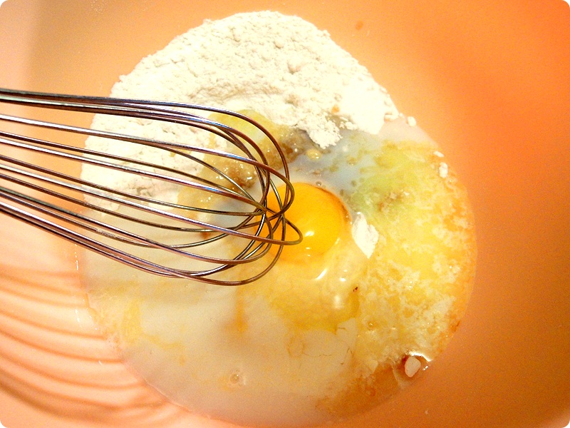 材料: Flour、バター、卵、砂糖、バニラ、ブルーベリー、牛乳