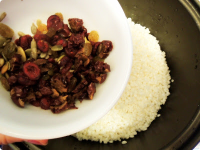 材料:もち米、水、水飴、ごま油、醤油、シナモンパウダー、ナツメ、干しぶどう、ナッツ