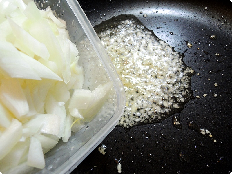 On a warm frying pan, add good amout of oil and chopped garlic