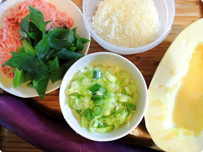 재료: 가지, 갈은돼지고기, 다진양파, 국수호박, 다진 파, 모짜렐라 치즈,