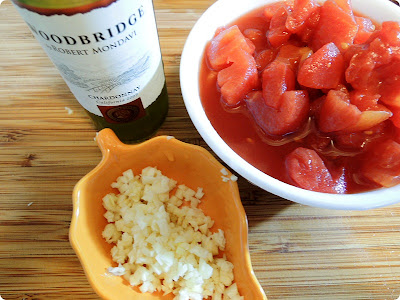 Sauce: minced garlic, canned tomatoes, white wine