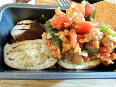 Ingredients: eggplant, ground pork, chopped onion, zucchini noodles, chopped green onions, mozzarella cheese