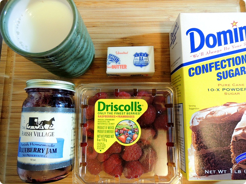 Skim milk, blueberry jam, fresh raspberry, 1/2 room temp. butter, confectioners sugar