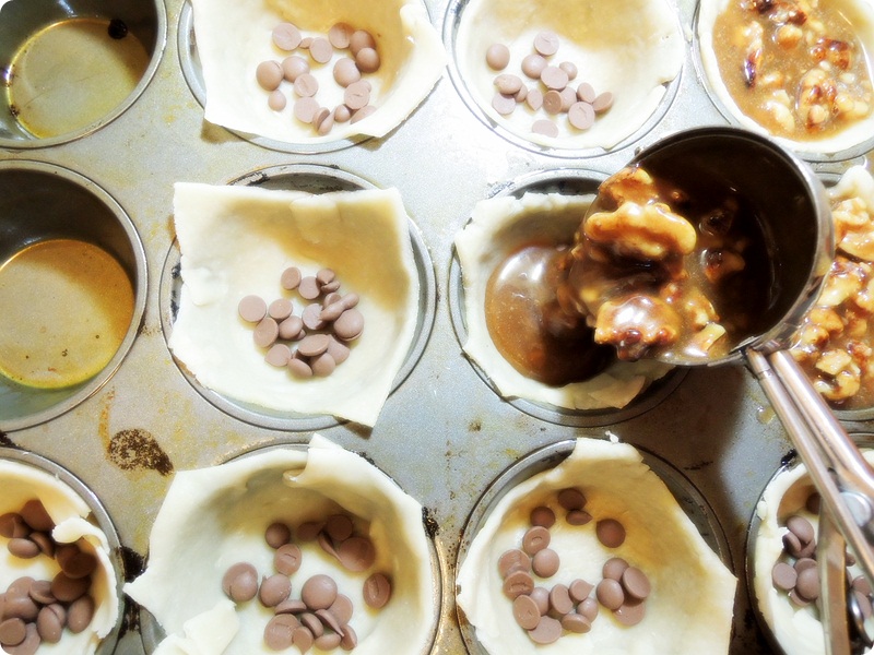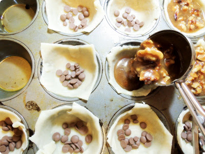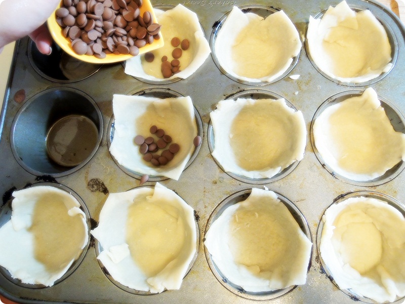 Place the pie skin in a cupcake mold, and add some chocolate chips