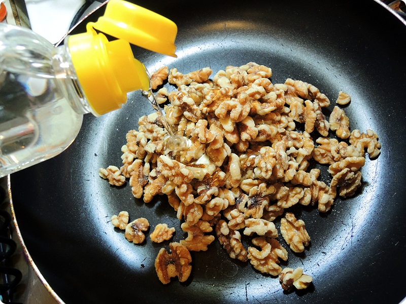 First, on a hot pan, add the nuts and some clear corn syrup. Stir the nuts and toste them and cool them.