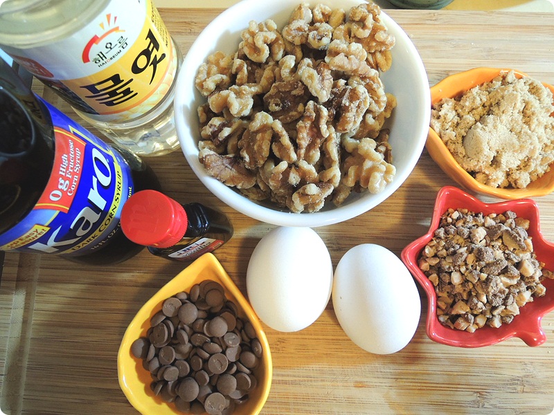 옥수수 시럽 (어두운거와 투명), 호두, 흑설탕, 토피넛과초콜렛 믹스, 계란두개, 바닐라, 초콜릿