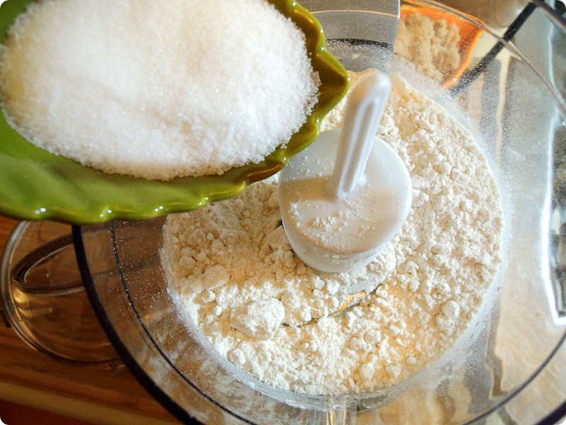 Let's make our pie crust! In food processer, add flour and sugar and blend well.