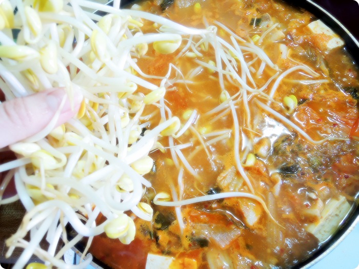 쉰 김치, 두부, 콩나물, 삼겹살, 간마늘, 쌀밥