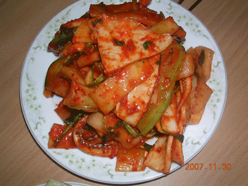 생물오징어, 오이, 무, 미나리, 고추장, 마늘, 고추가루, 설탕, 깨, 3배식초