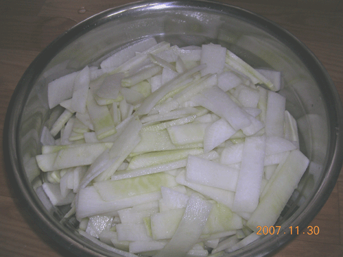 2. 무도 납작하고 길죽하게 썰어 소금에 살짝 절인 후 물기를 꼭 짠다.