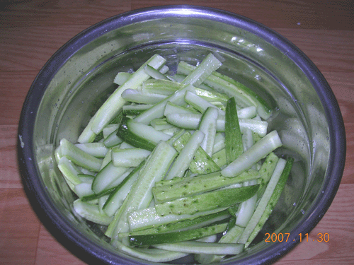 1. 오이는 길죽하게 썰어 소금에 살짝 절인 후 물기를 꼭 짠다.