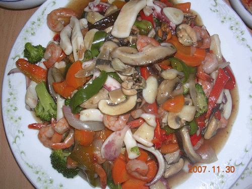 칵테일새우, 오징어, 소라, 양송이버섯, 표고버섯, 파프리카, 양파, 브로콜리, 통마늘, 생강 가루, 대파, 녹말가루, 굴소스, 당근, 패주, 참기름, 통깨, 후추가루 약간, 포도씨유