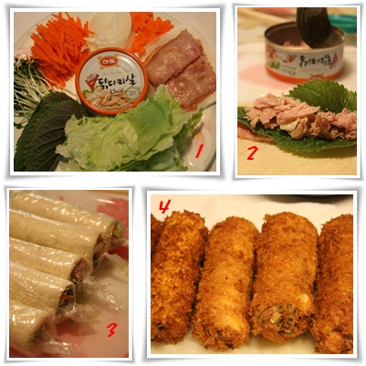 4. 랩을 벗긴 롤에 계란을 입히고 빵가루를 묻혀 기름에 튀기면