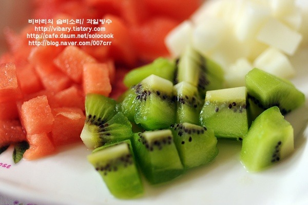 3,빙수 그릇에 얼음을 채우고 그 위에 과일을 얹습니다.