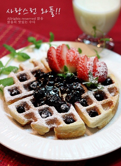블루베리 필링과 딸기를 올린 사랑스런 와플입니다.ㅎ
