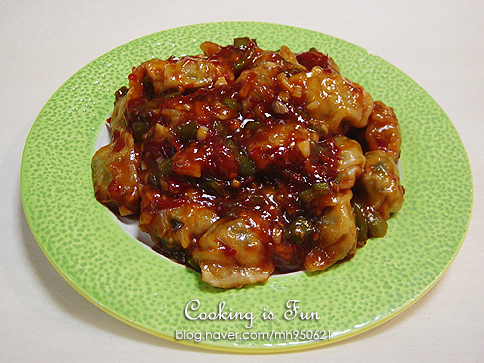 2. 다진 청피망과 마늘을 후라이팬에서 볶다가 두반장, 간장, 물엿, 설탕을 넣고 좀더 볶아줍니다.