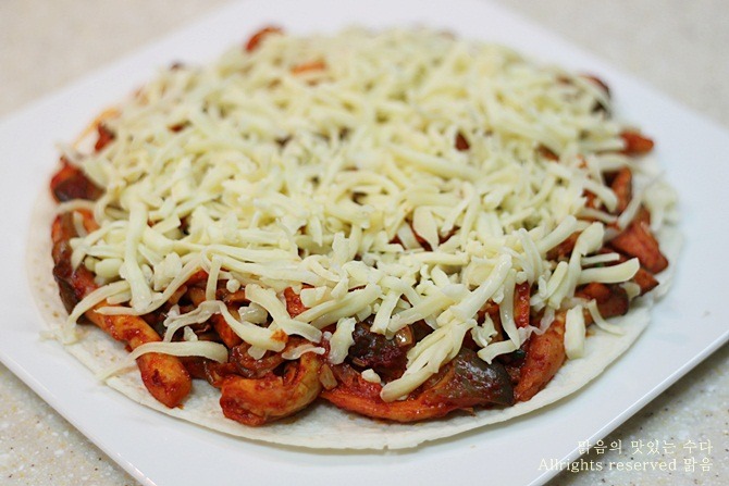 또띠아에 구운 매운느타리버섯무침을 올리고...