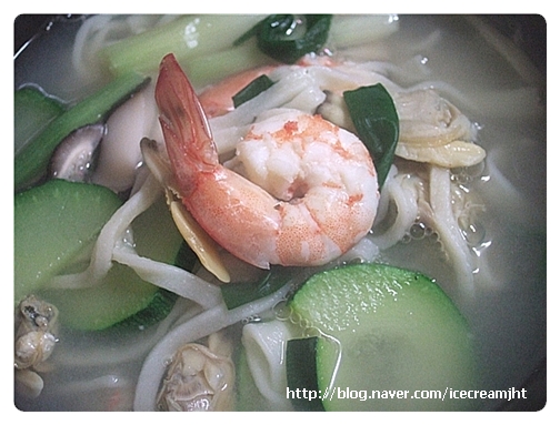 국물이 끓으면 칼국수면을 넣고 끓이다가 야채와 바지락살, 새우 등 모두 넣어 끓여준다