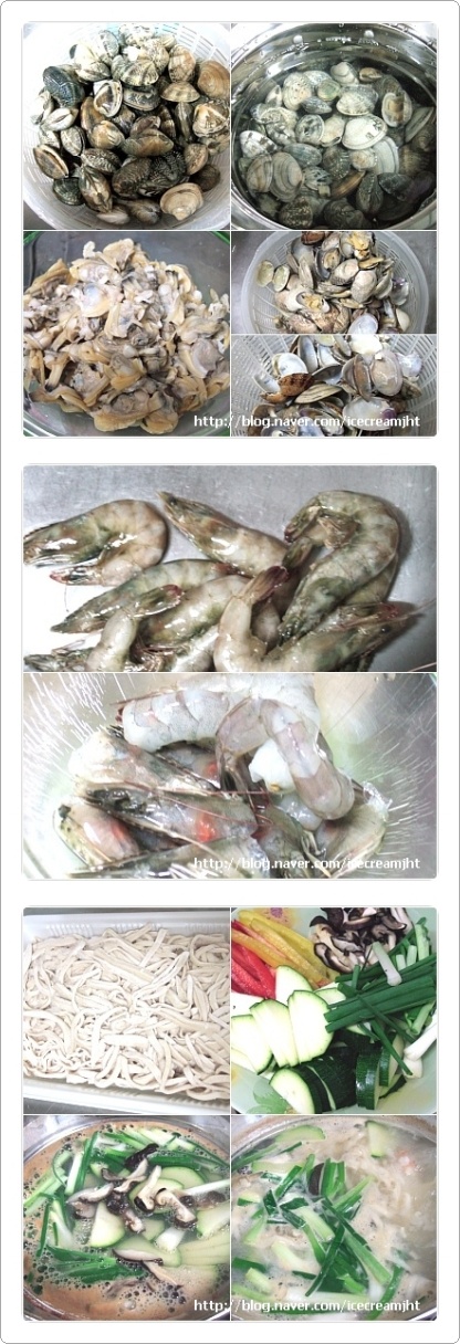부재료: 바지락, 생새우, 칼국수면, 쪽파, 건표고버섯, 호박, 국간장, 후춧가루