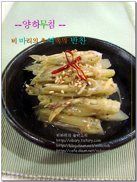 팁: 향이 매우 독특 하므로 아주 간단하게 무치는 것이 양애의 특성을 가장