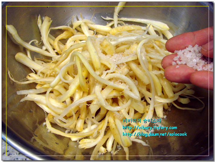 1, 도라지는 벗겨서 굵은소금 한주먹 넣고 바락바락 주물러서 헹군다음 잠시 물에 담가